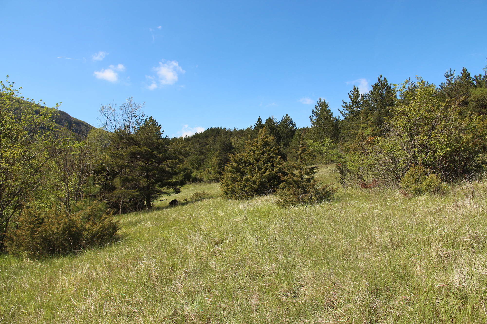 Ce très grand terrain (8 hectares) est situé au col de Marignac. Il est en bonne partie boisée mais héberge également d'anciennes prairies de fauche qui pourraient (à condition d'aménagements importants) être converties en espace de maraîchage. Depuis deux ans Tim s’y investit à ses heures perdues… Il y a notamment travaillé avec ses copains de l’association Graine alternative, avec les élèves de la MFR de Mondy, les élèves du CFPPA de Die, et d’autres encore… Résultat : le terrain évolue, les greffes sauvages reprennent, les toilettes sèches et cabanes vivantes voient le jour, mais il reste beaucoup à faire pour parvenir à un site de production potentiel, et donc pouvoir envisager sa mise à disposition pour l'association.