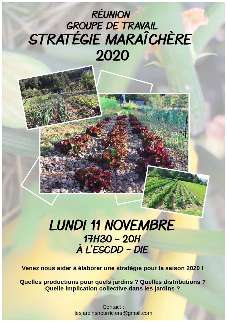 C'est pour vous exposer ces questionnements, et y trouver des réponses collectives, adaptées à tous les adhérents de l'association, que nous vous invitons à une réunion "Stratégie maraîchère 2020" qui aura lieu lundi 11 novembre, de 17h30 à 20h à l'ESCDD de Die.