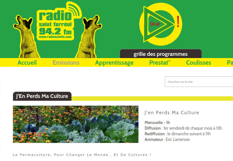 Parmi ses divers projets, Eric s’est mis à la radio. Il produit une émission thématique sur la permaculture « j’en perd ma culture », sur les ondes de Radio St Ferreol.