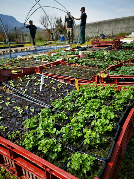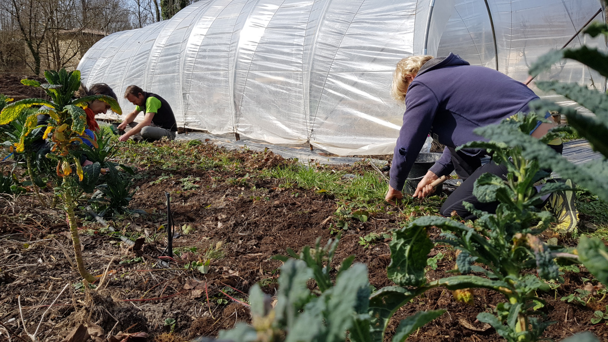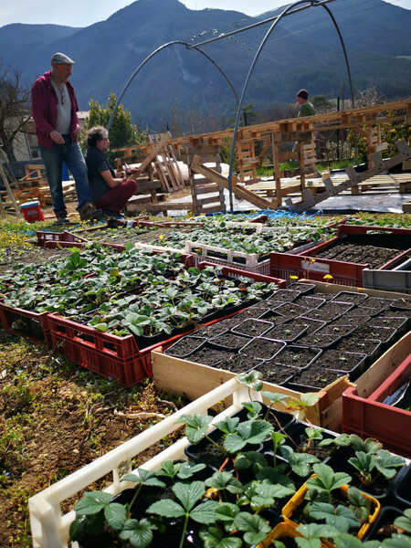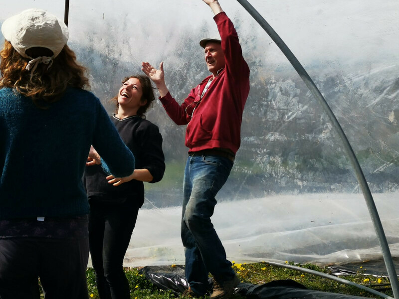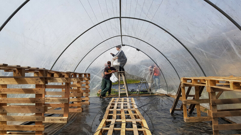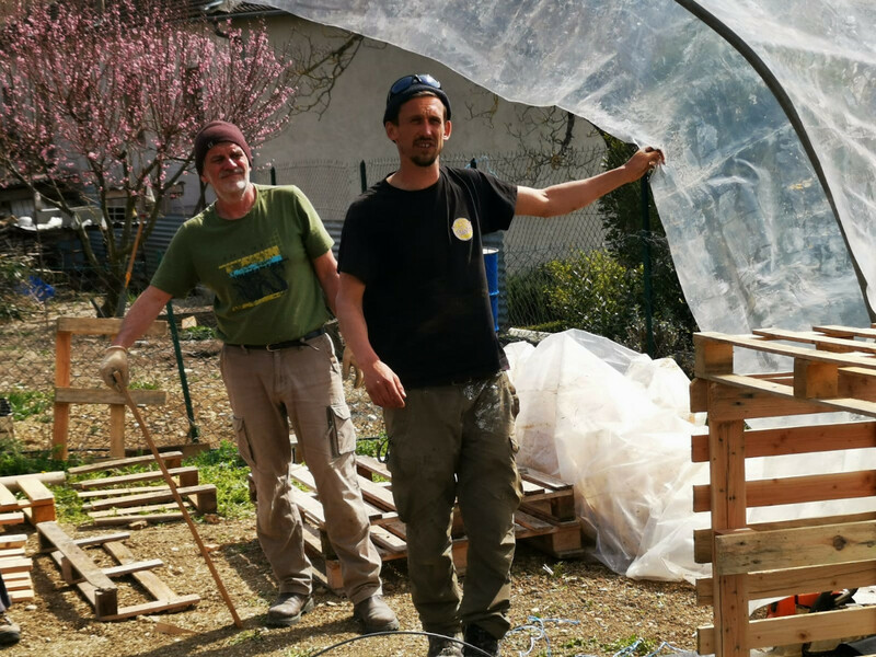 Ici, l'aperçu d'une journée de travail aux Jardins Nourriciers. Montage de serre, nettoyage de cuve, arrosage de semis et sourires !