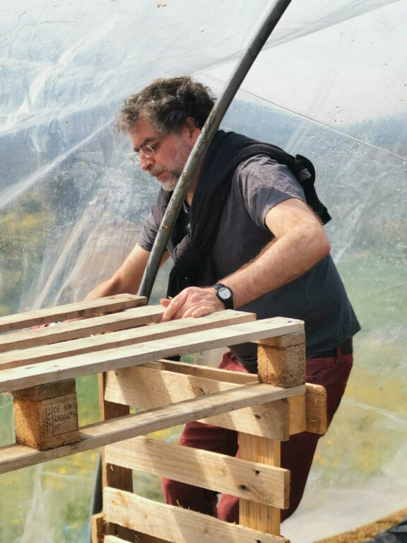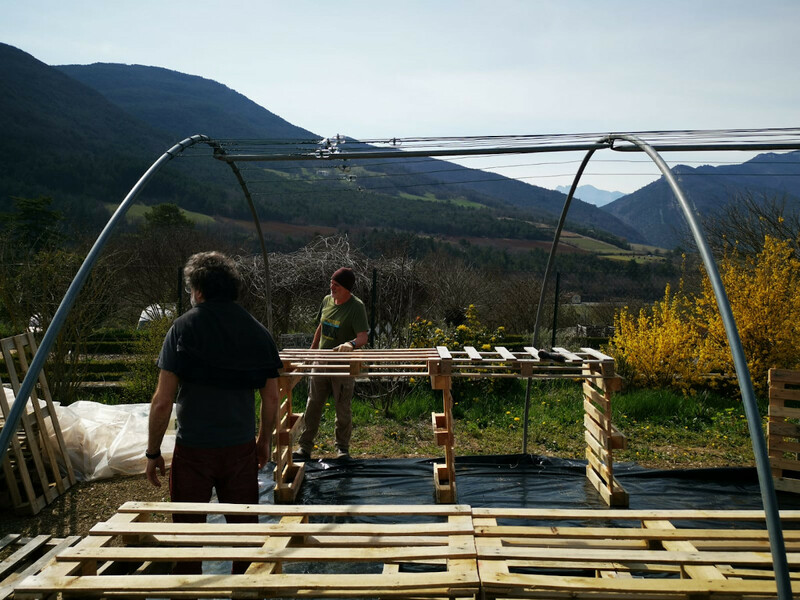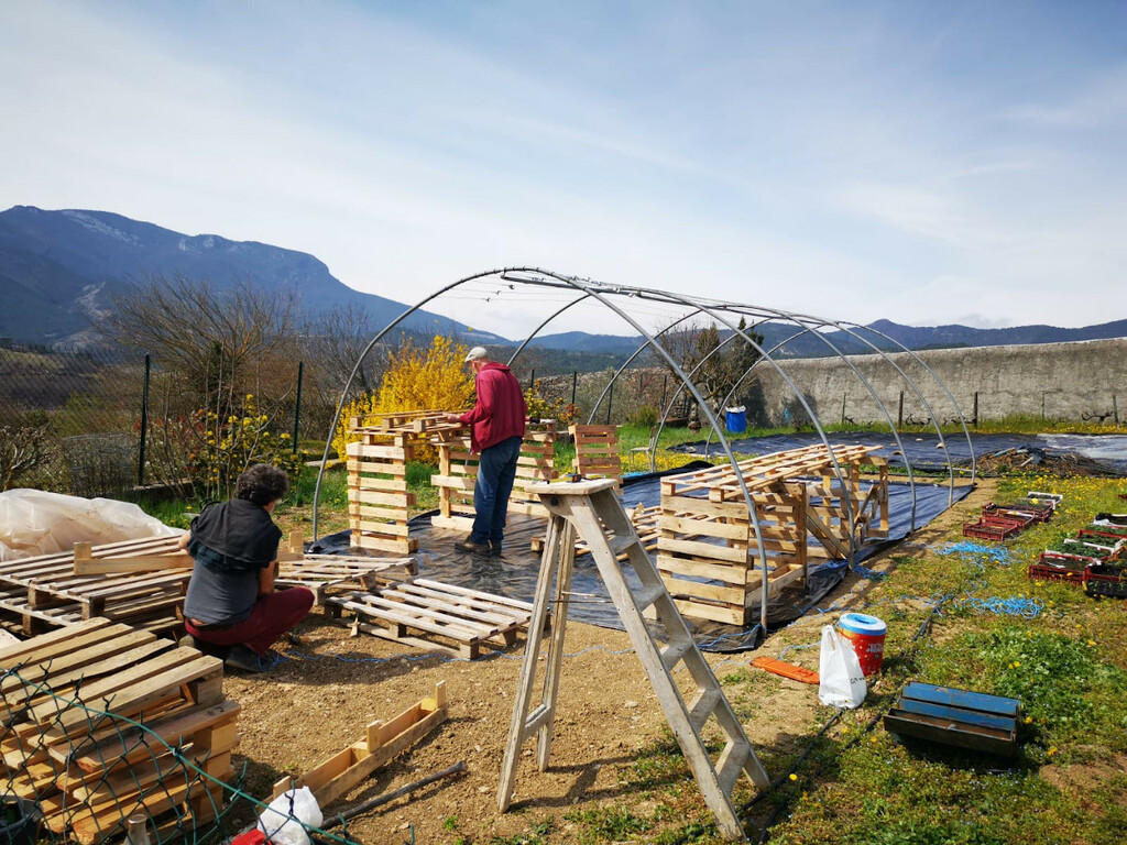 On monte des meubles en palettes pour accueillir les plants !