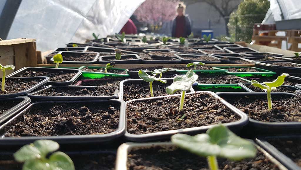 Pour les besoins des cultures des jardins mis à disposition de l'association, les Jardins Nourriciers produit ses propres plants de variétés maraîchères, d'aromatiques et d'auxiliaires des cultures. Dans la logique d'en faire profiter ses adhérents, elle produit plus que la culture des jardins n'en nécessite. Dès le mois d'avril pour les variétés maraîchères, l'association propose toute une gamme de plants agro-écologiques et biologiques. Leur culture et leur développement sont orientés vers le meilleur compromis entre résistance aux ravageurs et aux conditions climatiques difficiles et productivité, contrairement aux plants de jardinerie, souvent très grands dès le mois d'avril, mais aussi très fragiles. Il peut également arriver que les Jardins Nourriciers proposent, en complément et dans le cadre d'achats groupés, des plants issus de producteurs biologiques locaux.